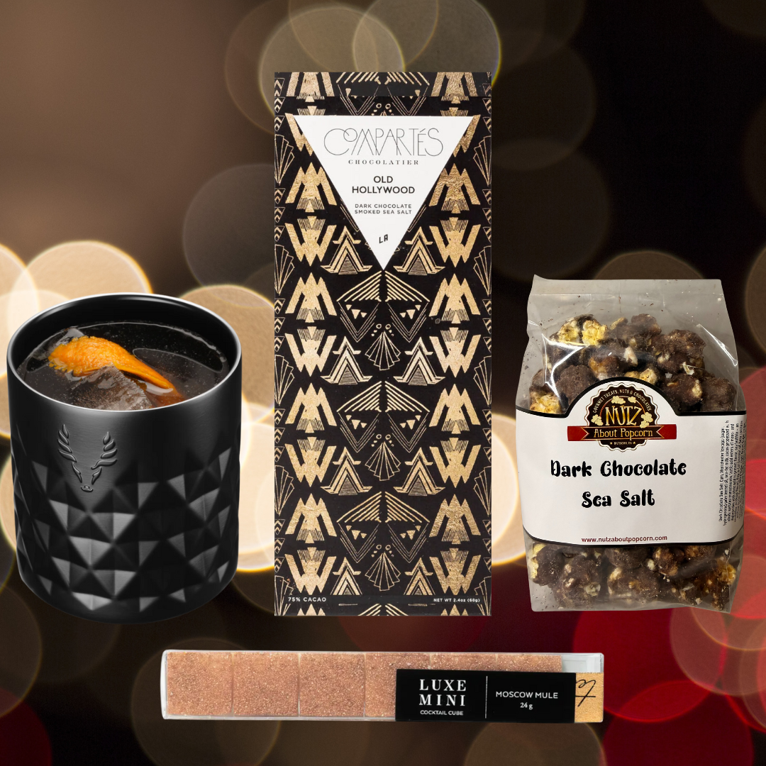 Old Hollywood Smoked Salt Dark Chocolate Bar: Twice the Compartes in this box means twice the fun! Salted dark chocolate bar that's decadently delicious, art deco and timeless. A blend of gourmet dark chocolate with a sprinkling of smoked sea salt, making this luxury chocolate bar an elegant twist on a classic.